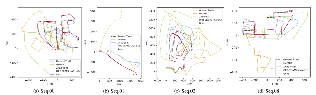 论文的实验方面,是在Cityscapes数据集上进行预训练的,在KITTI数据集上进行测试。比较了当前较好的自监督VO:GeoNet, Vid2Depth, Zhan, SAVO, Li以及经典算法ORB-SLAM2和VISO2。另外对比了Zhao和DF-VO,这两种算法都结合了预训练网络和经典的VO过程。