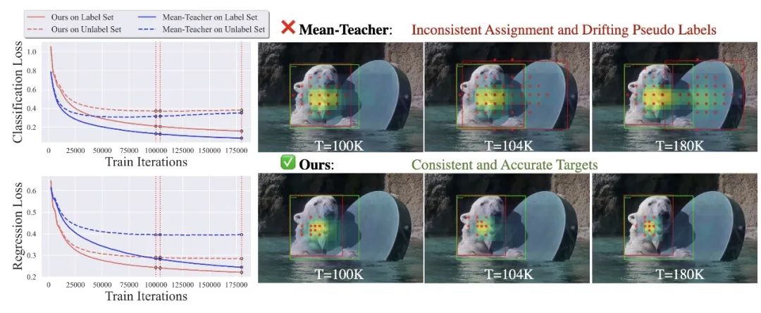 (左)比较“Mean-Teacher ”和“Consistent-Teacher”的训练损失。在Mean-Teacher中,不一致的伪目标导致分类分支上的过拟合,而回归损失变得难以收敛。相反,新提出的方法为学生设定了一致的优化目标,有效地平衡了这两项任务并防止了过度拟合。