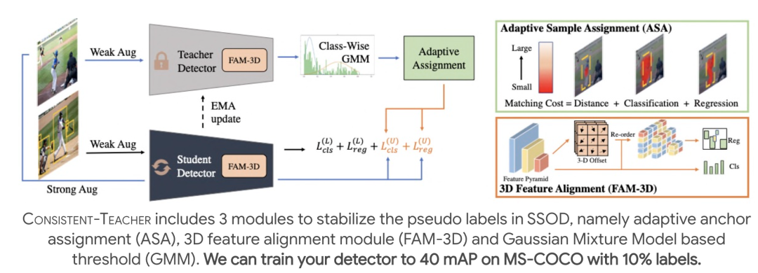在本研究中,研究者深入研究了半监督目标检测(SSOD)中伪目标的不一致性。核心观察结果是,振荡的伪目标破坏了精确的半监督检测器的训练。它不仅给学生的训练注入了噪声,而且导致了分类任务的严重过拟合。因此,研究者提出了一个系统的解决方案,称为一致教师,以减少不一致。首先,自适应锚分配(ASA)取代了基于静态IoU的策略,使学生网络能够抵抗噪声伪边界盒;然后,通过设计三维特征对齐模块(FAM-3D)来校准子任务预测。它允许每个分类特征在任意尺度和位置自适应地查询回归任务的最优特征向量。最后,高斯混合模型(GMM)动态地修正了伪框的得分阈值,从而稳定了基本事实的数量