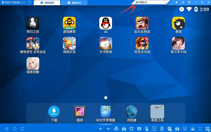 2、安装完成并打开,在天天模拟器的搜索框搜索“梦幻西游3D”,然后点击下载,安装到模拟器内。