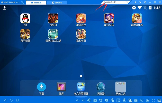 2、安装完成并打开,在天天模拟器的搜索框搜索“仙剑奇侠传九野”,然后点击下载,安装到天天模拟器内。