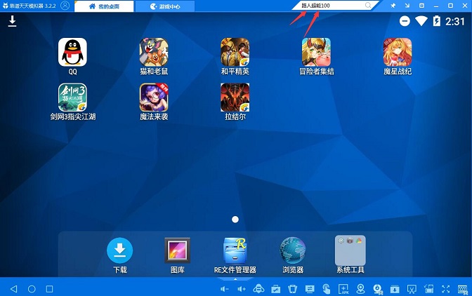 2、安装完成并打开,在天天模拟器的搜索框搜索“路人超能100”,然后点击下载,安装到模拟器内。