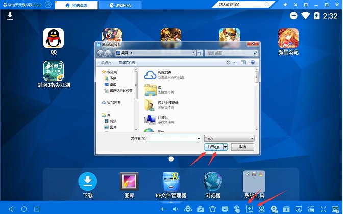 3、过一会儿你就可以看到已经安装好的路人超能100游戏图标在天天模拟器我的桌面上。若天天模拟器没找到路人超能100游戏,就在天天模拟器我的桌面界面,点击一下右下角apk按钮,到路人超能100手游官网下一个游戏安装包添加到天天模拟器里面就可以啦!