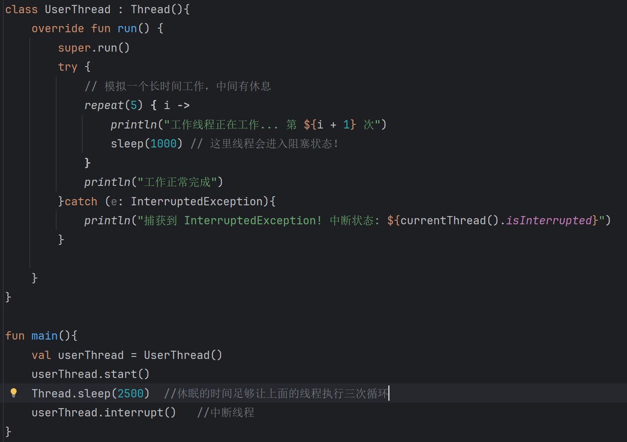 所以如果你自己自定义一个取消标志位来中断线程,是无法在阻塞状态下感知到你改变了取消标志位,也就无法及时中断线程。