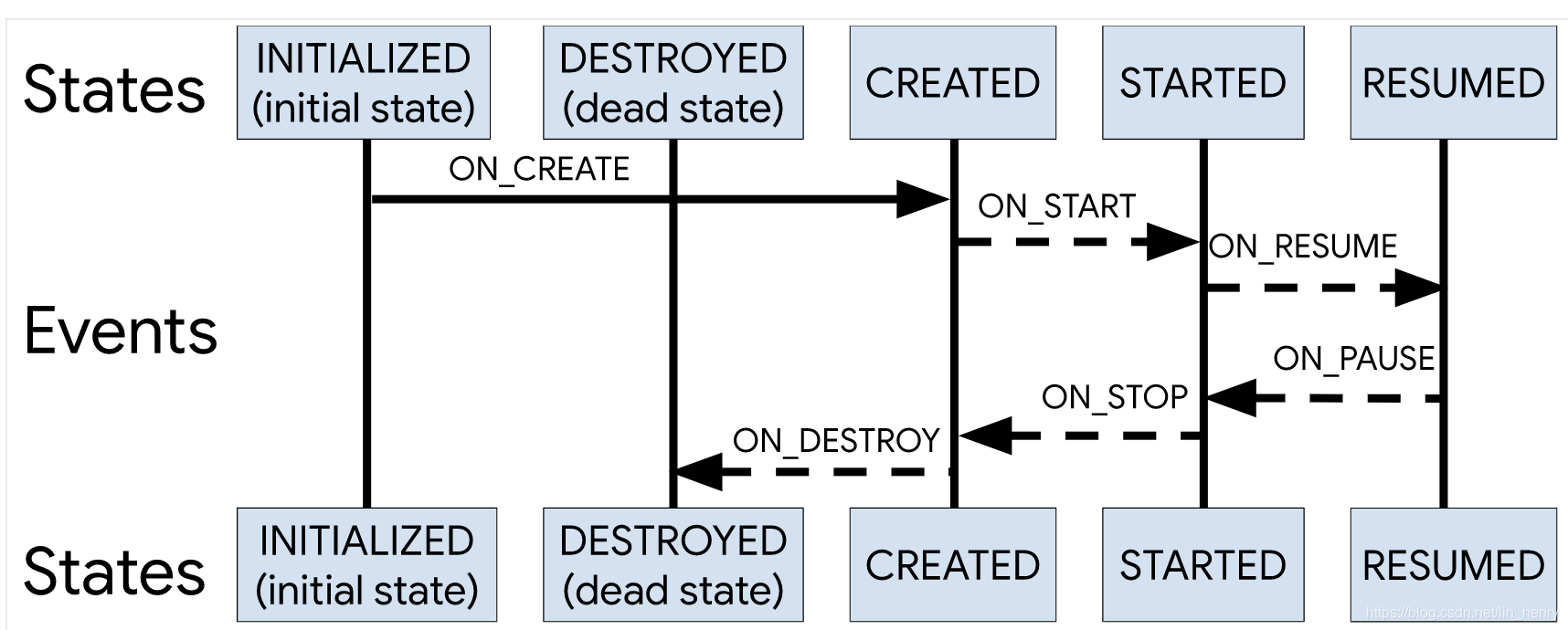 Lifecycle是一个持有组件生命周期状态(如Activity或Fragment)的信息的类,并允许其他对象观察此状态。 - Event :从框架和Lifecycle类派发的生命周期事件。这些事件映射到活动和片段中的回调事件。