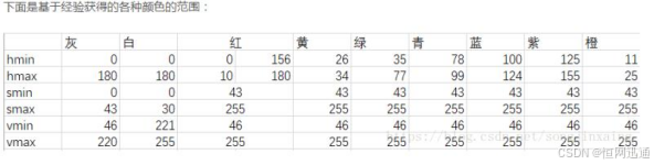 要想实现颜色的识别,我们要打开摄像头,或读取一张图像。将图像的BGR颜色通道转化为HSV,然后设置HSV的阀值指定颜色范围(我们要检测的颜色范围)。我们使用inRange()函数实现二值化功能(这点类似threshold()函数),更关键的是可以同时针对多通道进行操作,使用起来非常方便!主要是将在两个阈值内的像素值设置为白色(255),而不在阈值区间内的像素值设置为黑色(0),该功能类似于之间所讲的双阈值化操作,能得到掩模(mask)图像。