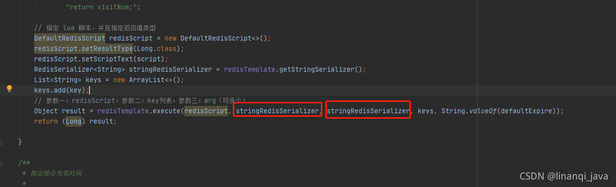 Object result = redisTemplate.execute(redisScript, stringRedisSerializer, stringRedisSerializer, keys, String.valueOf(defaultExpire));