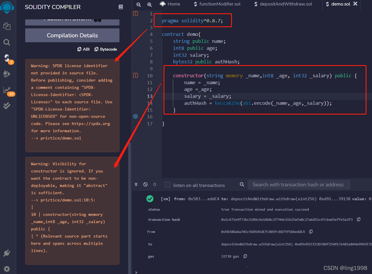解决:(1)警告一:在首行增加SPDX许可标识符;(2)constructor去除修饰符public