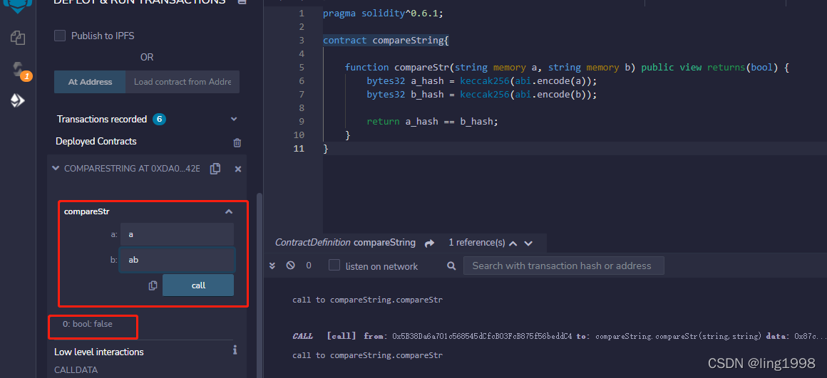 function compareStr(string memory a, string memory b) public pure returns(bool) {