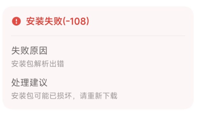 在开发android时,build出来的apk文件,在android 12上安装时,出现安装失败(-108)的问题,如下图所示: