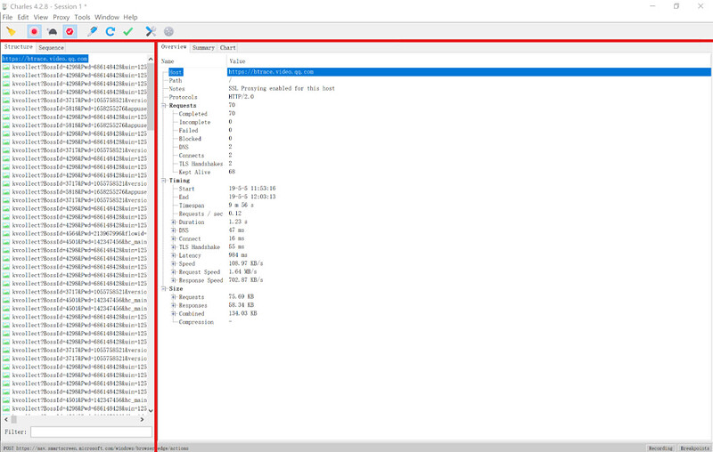 Charles 上边是菜单栏,左边记录了访问过的每个网站/主机,右侧显示信息细节。