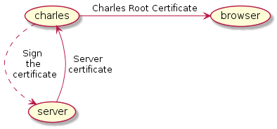 Charlse 是中间工具,替浏览器查看服务器的证书并签名,但同时会把自己的证书发给浏览器,因此会出现警告,需要添加到信任序列才能正常使用,下面是工作图: