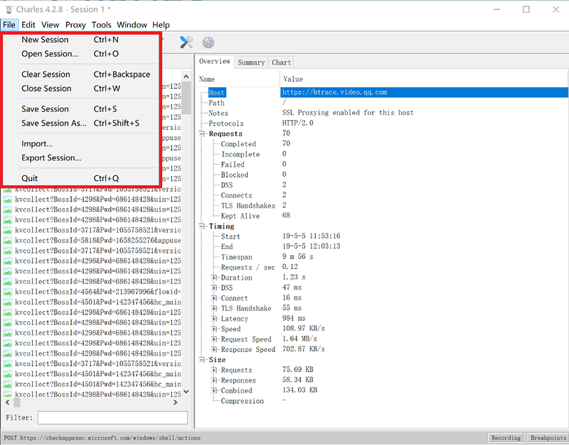 Charles 可以存储各种网络请求信息,所有的请求和响应都会记录到 session 中,可以进行检查和分析。打开菜单栏中的File,在这里管理 session,包括新建、打开、清空等等。