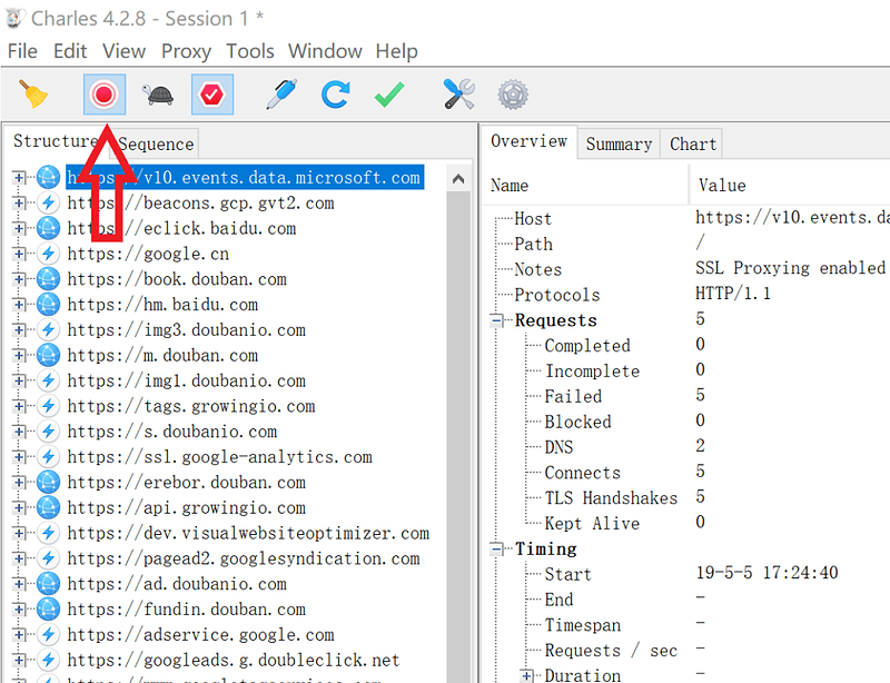 也可以关闭记录,如果关闭记录,Charles 会正常通过所有请求,但它们不会记录在 session 中,点击下面来关闭记录: