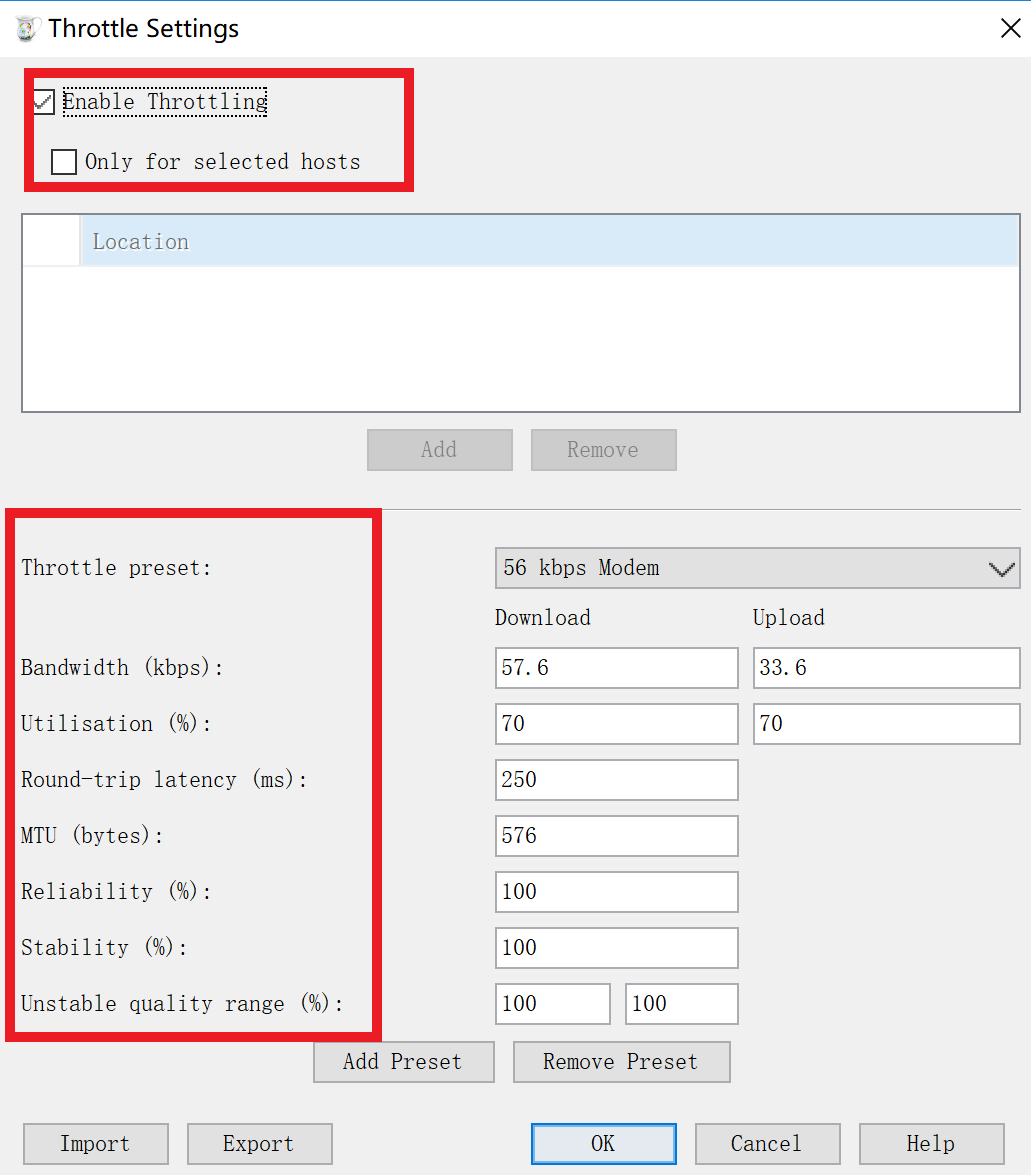 Throttle Preset:选择网络类型,比如选择 56 kbps modem