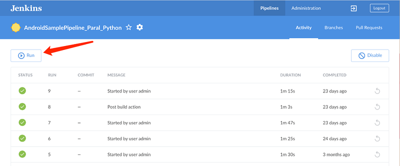 在 Blue Ocean 中打开 Pipeline 任务,单击 Run 按钮可以直接运行该任务。