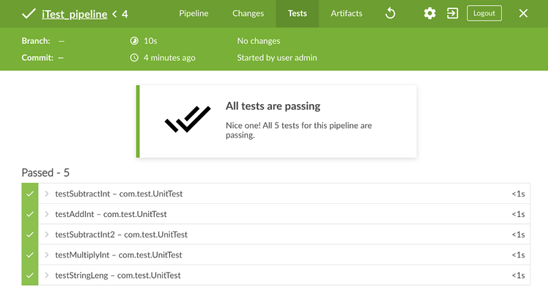 对于包含单元测试的项目,Blue Ocean 可以运行单元测试并对其结果进行展示。下面用 java 单测项目进行举例。