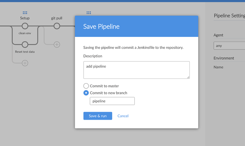编辑完后会生成 Jenkinsfile,并提交到你的代码库根目录,你可以选择提交到 master 分支或者提交到一个新创建的分支。提交成功之后就会开始执行一次完整的构建过程。