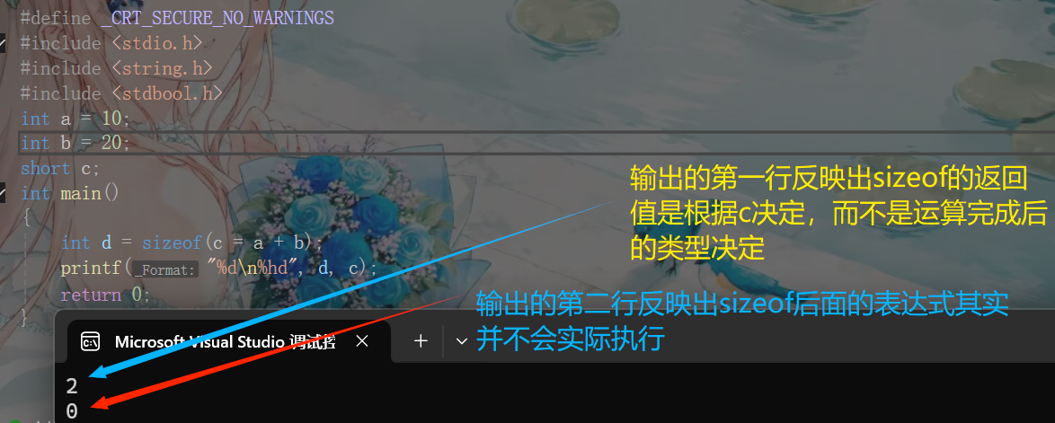 sizeof 表达式 sizeof后面的表达式不会真实参与运算,即不执行,根据表达式的类型来得出长度大小。例如该代码