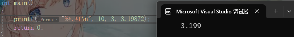 注:限定小数位数可以和限定宽度占位符结合使用(要先写宽度再写限定小数位数位数)(有俩种方法,一种为直接写,一种为 "%*.*数据类型",第一个*,第二个*,数据类型)