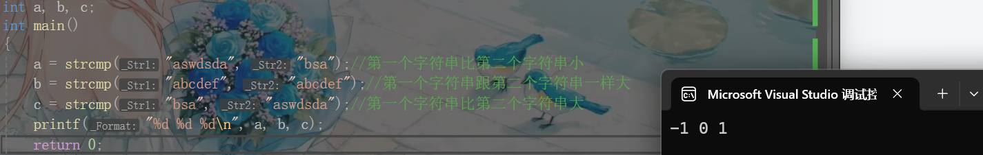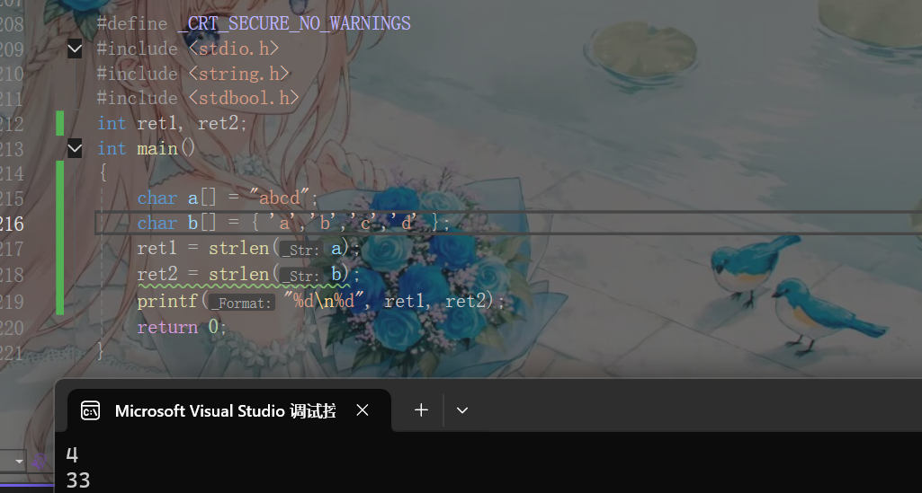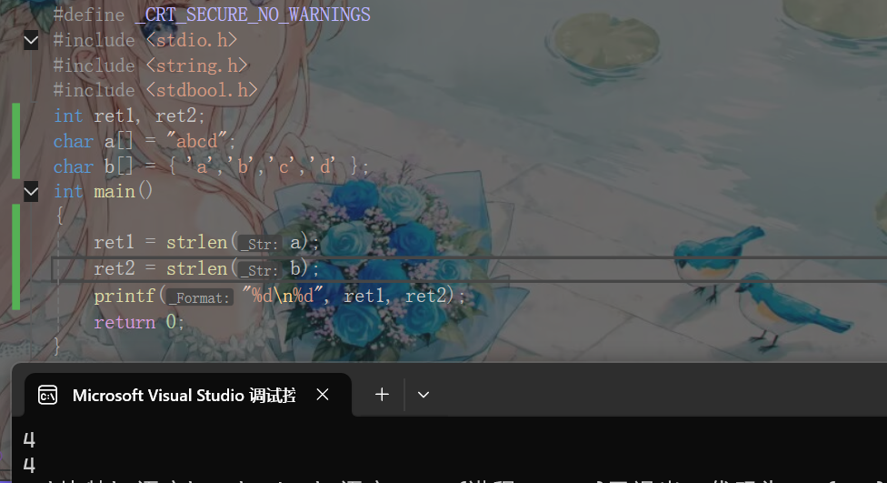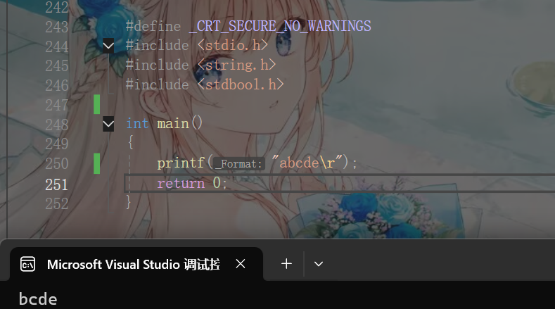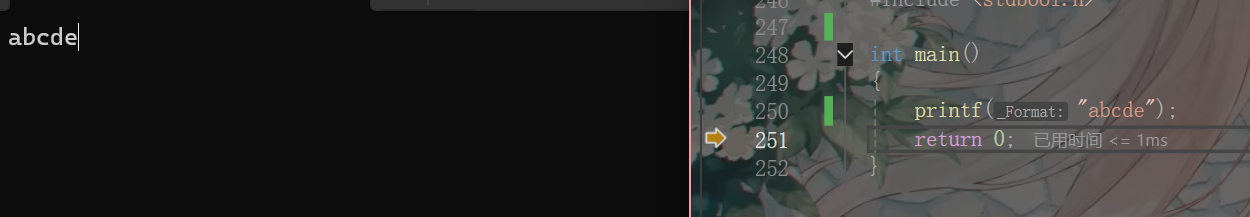注:2图虽然调试时候是abcde,光标在e前面,但最终输出时候输出的是abcd,这种情况是输出台有输出空格然后覆盖了(可以简单理解成光标后面有字符就强转为空格),只需要在最后加个\n换行把光标移到下一行去就好了