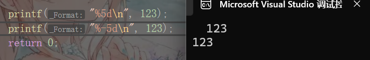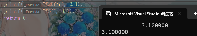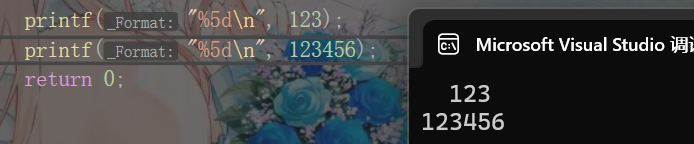 可在%和类型中间加数字,表示限定宽度为多少(输出为右对齐,左边不足补空格,若长度超过最小宽度,就原样输出)如图