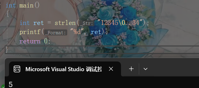 转义字符在计算长度时算一个字符,在算字符串长度时,遇到 \0 就停止,如图,因为遇到的\0,所以最终输出结果为5(不要把\0和\0几或者\0几几搞混了,要注意\0后面没有数字的才算\0)