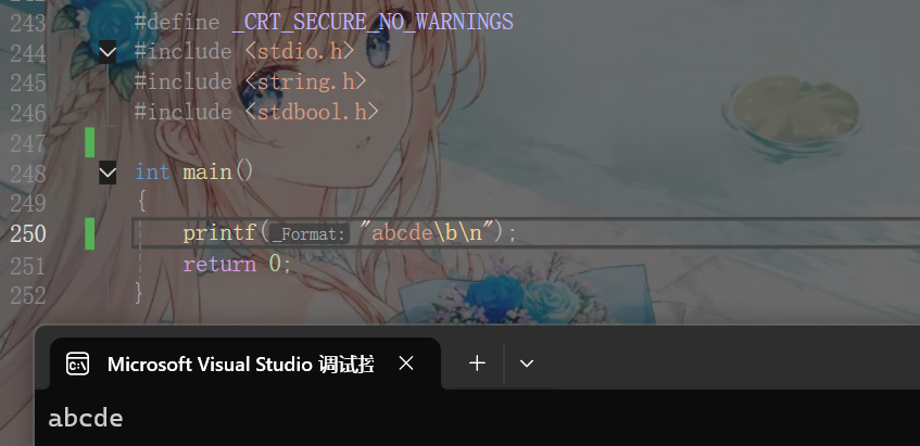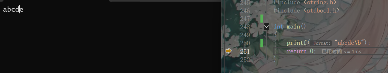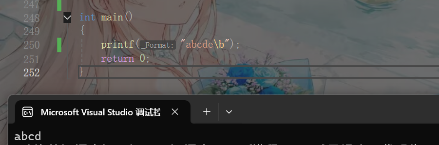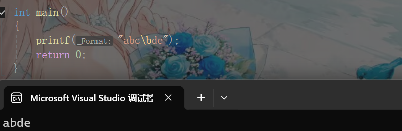 通过图片,不难看出,一开始打印了abc,但因为\b使光标往前移动了一位,导致后面打印的d将c覆盖,最后打印出了abde