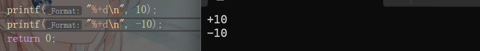 默认输出只会显示-,不会显示+,若想让他显示+,只需在输出格式前加一个+即可,此时不管是整数还是负数都会加上正负号,如图