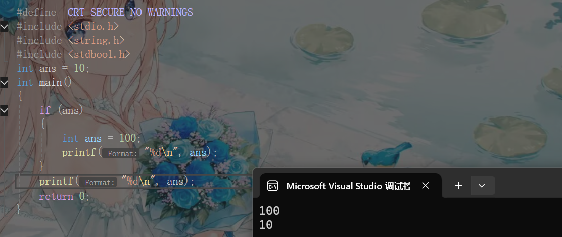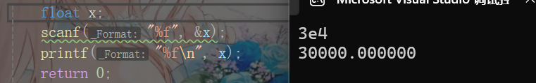 那么细心的人可能发现了,为什么scanf下面会有绿波浪呢,相信很多人打代码时候也会出现这个绿波浪线,那么是为什么的,其实很简单,就是scanf其实是有返回值的,但我们并没有接收他的返回值,所以报警告了,这个在下面细讲。