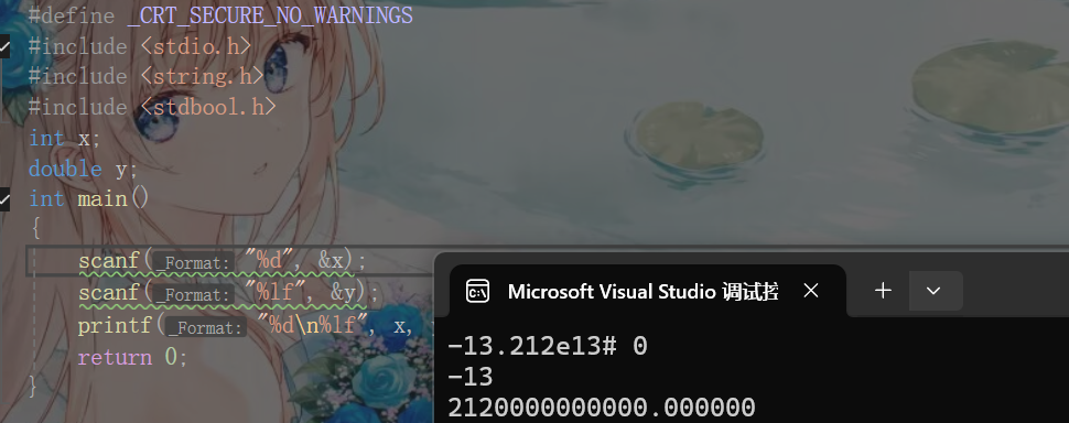 若不理解可以看下边的代码进行理解,输入为"-13.212e13# 0 ",全部放入缓存,遇到 ' . ' 时不符合整型条件,结束读入,接着输入y,从 ' . '开始解读,因为' . '也属于浮点型的一部分,就接着往后读,直到读到 ' # ',不符合条件,结束读入(e是科学计数法的表示法表示10的几次),看最后输出结果即可
