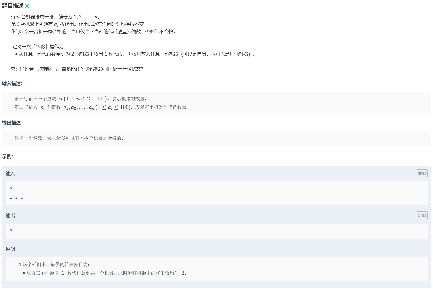这个题目的意思就是给你n个机子,每个机子上都有代币,如果机子上的代币为偶数个,那么这个机子就是合格的,如果机子上的代币为奇数个,那么这个机子就是不合格的