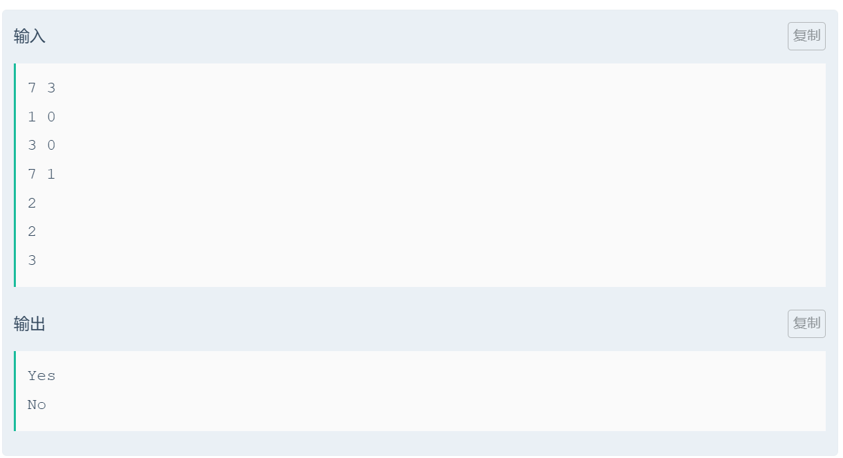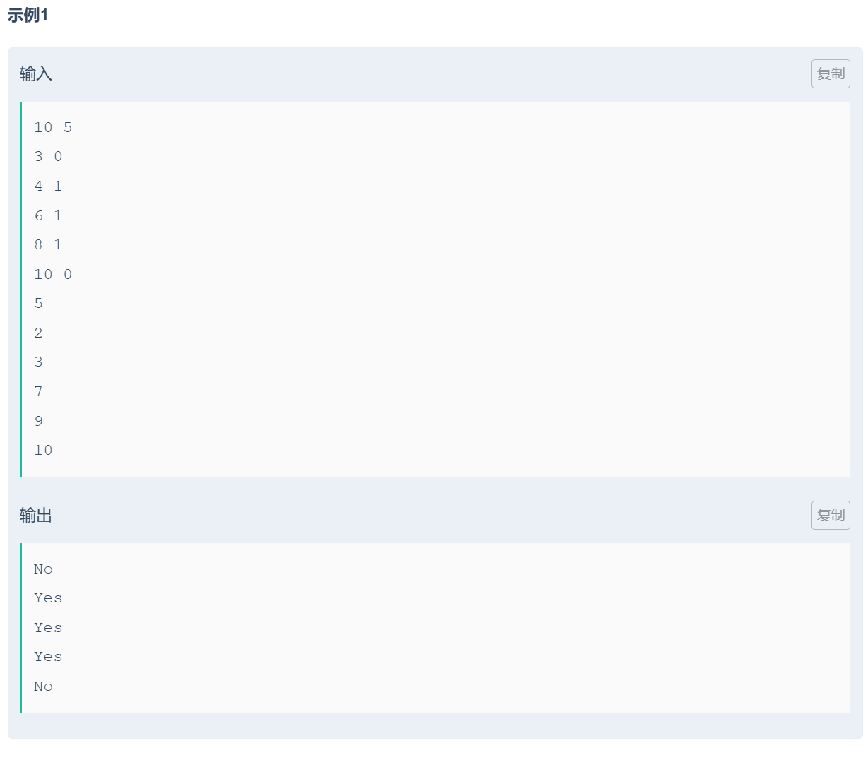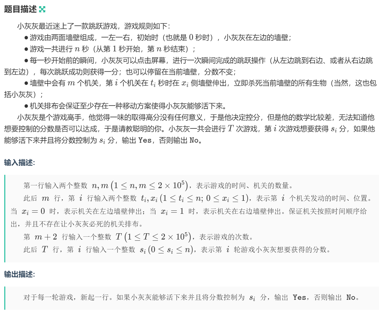 这题逻辑也很简单,先算出最小可能得分,再算出最大可能得分,然后后面每次查询得分时,就判断得分是不是在得分区间内,如果在区间外,就输出No,如果在区间内再进行判断,然如果t时间时有障碍物,那么就直接输出Yes,反之,就判断,分-最小分能不能被2整除,能就输出Yes,不能就输出No