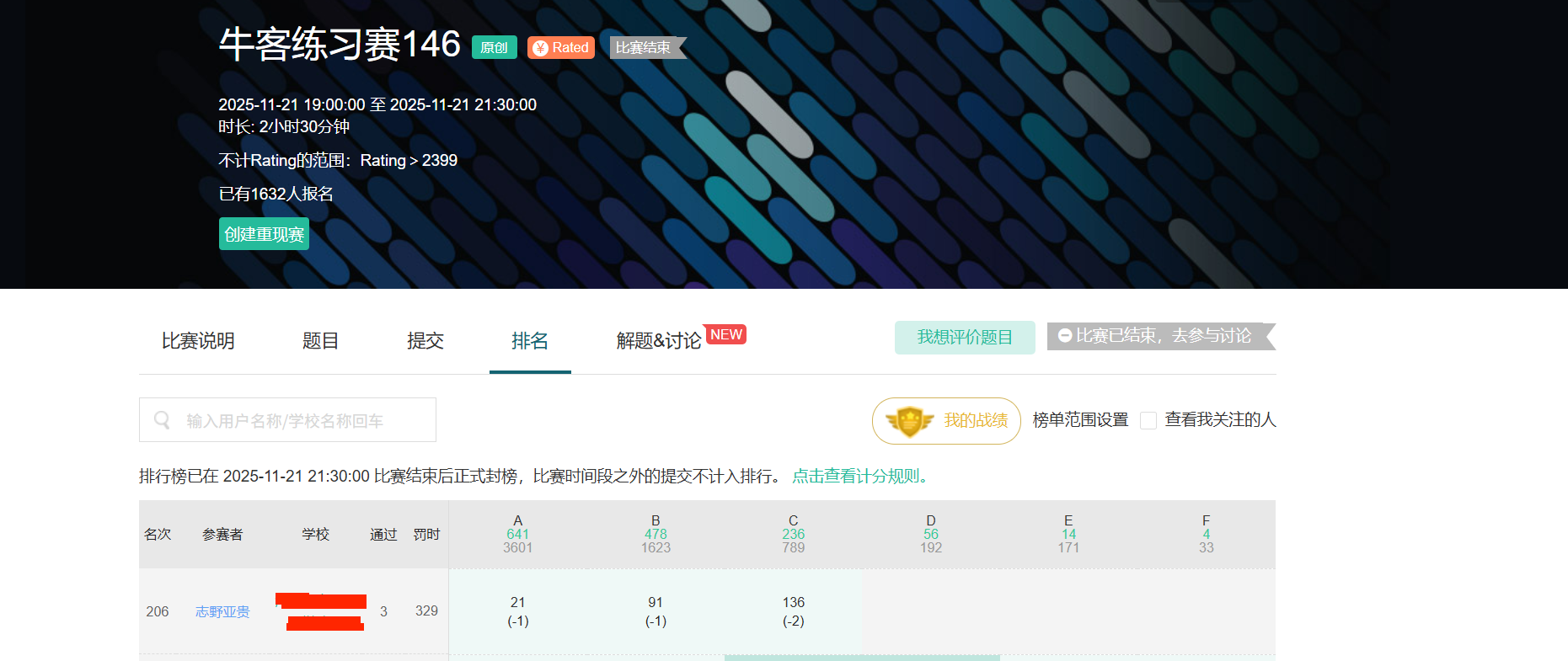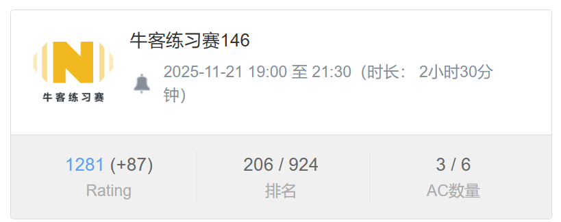 这场比赛的链接在这(8条未读私信) 牛客练习赛146_ACM/NOI/CSP/CCPC/ICPC算法编程高难度练习赛_牛客竞赛OJ