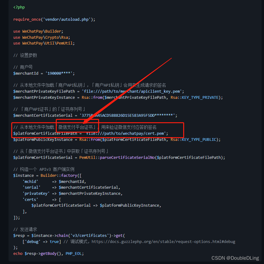 因为在创建微信支付客户端的时候需要这个微信支付平台证书路径:如下图