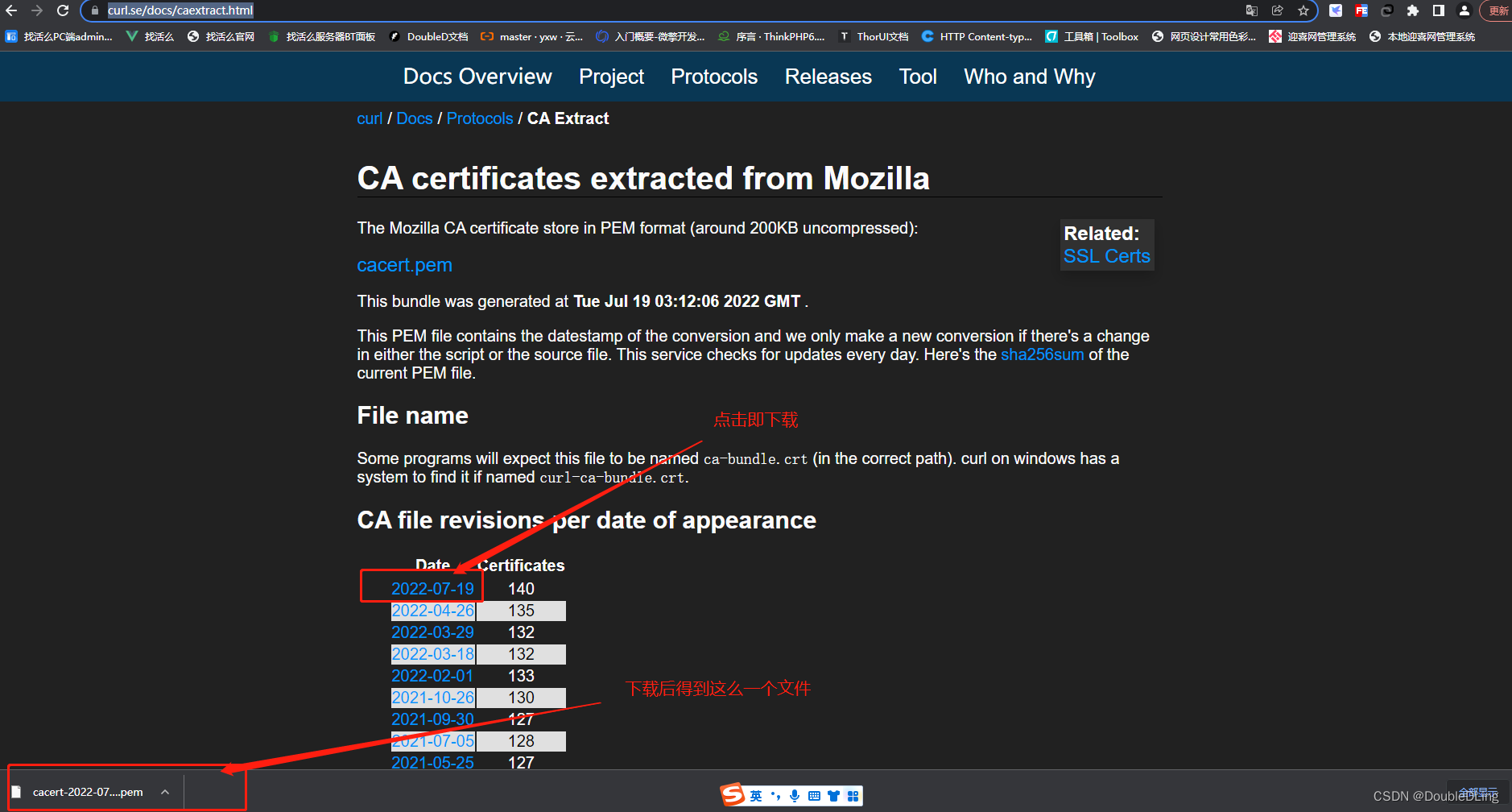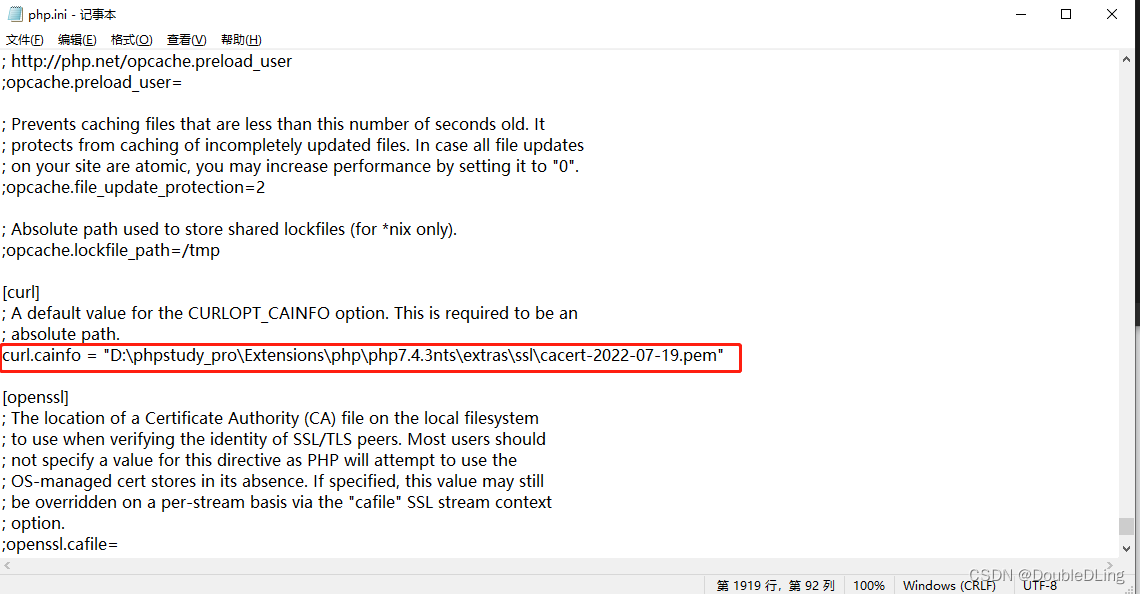 然后修改当前使用的php版本的php.ini文件,把下图这句加上并且替换成你的CA证书文件路径