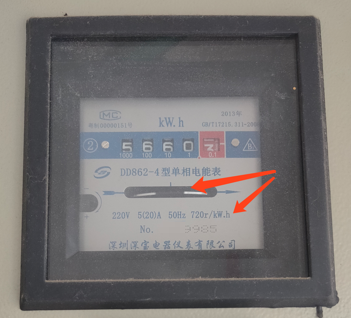 首先要找到我们家对应的电表,电表上有两个信息非常重要,720r/kW.h和圈数。