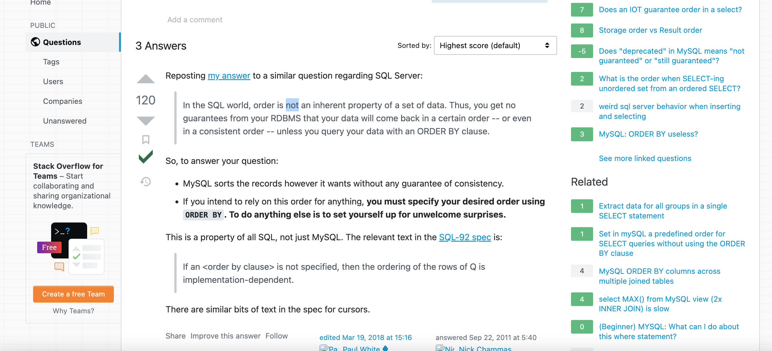 在关系数据库中没有“自然顺序”或类似的东西(至少在我所知道的情况下)。获得可靠排序的唯一方法是显式指定 order by子句,来源when-no-order-by-is-specified-what-order-does-a-query-choose-for-your-record。