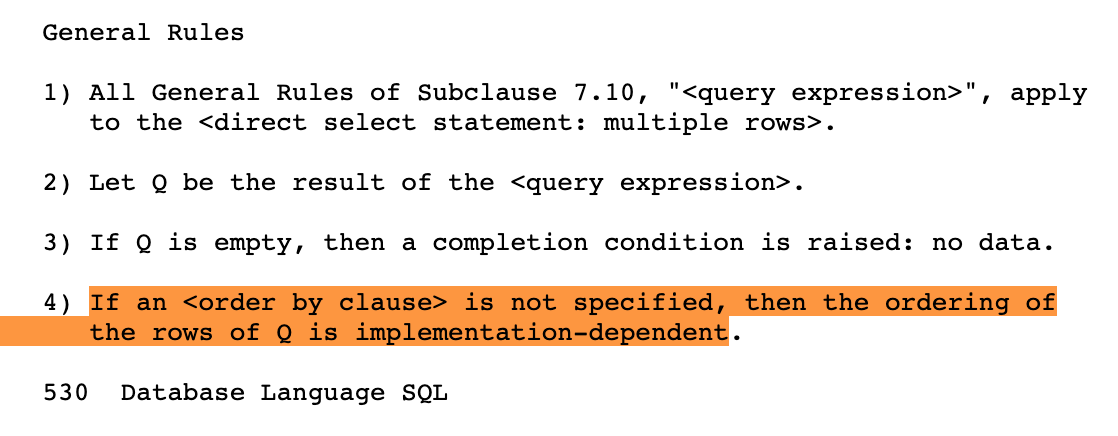 如果未指定 <order by 子句>,则 Q 的行的顺序取决于底层实现。