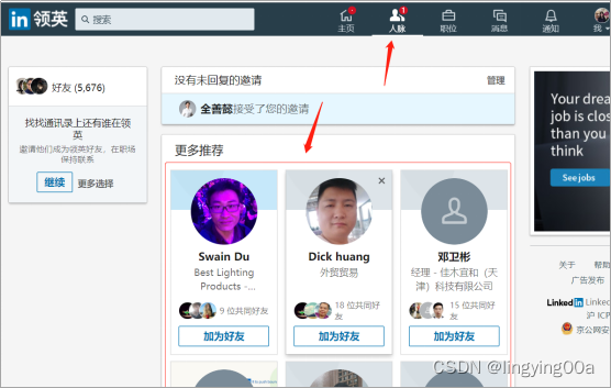 这时应该充分利用好Linkedin系统推荐的人脉,Linkedin会根据你的教育经历、工作经历、行业等信息推荐相似的人脉,这些人是可以添加的,而且通过率会很高。通过系统推荐人脉构建自己的初始人脉圈。