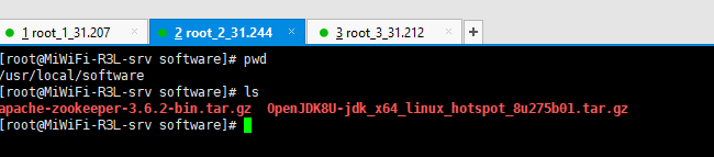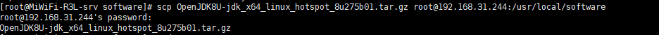 /usr/local/software目录下执行:scp OpenJDK8U-jdk_x64_linux_hotspot_8u275b01.tar.gz root@192.168.31.244:/usr/local/software