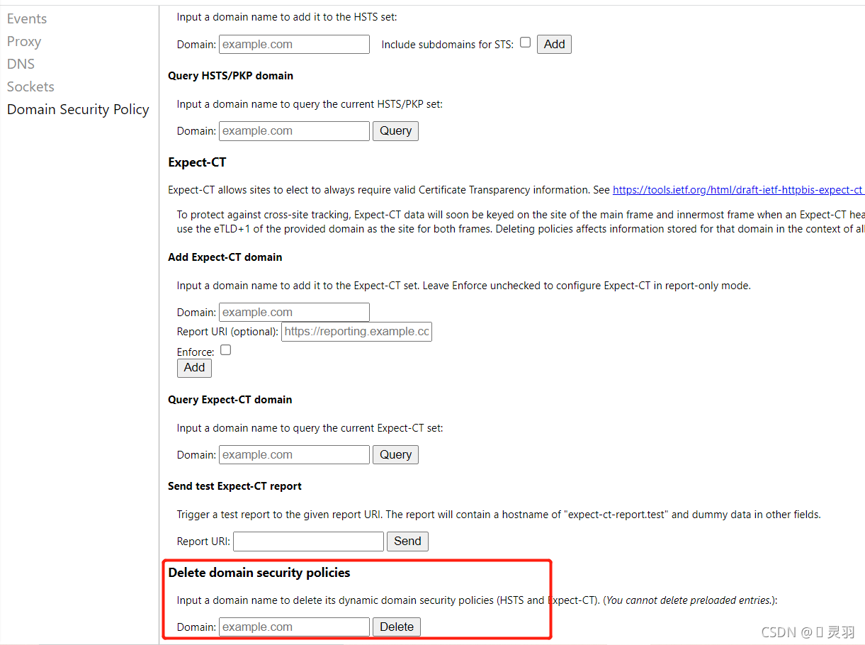2.找到底部Delete domain security policies一栏,输入想处理的域名,点击delete。