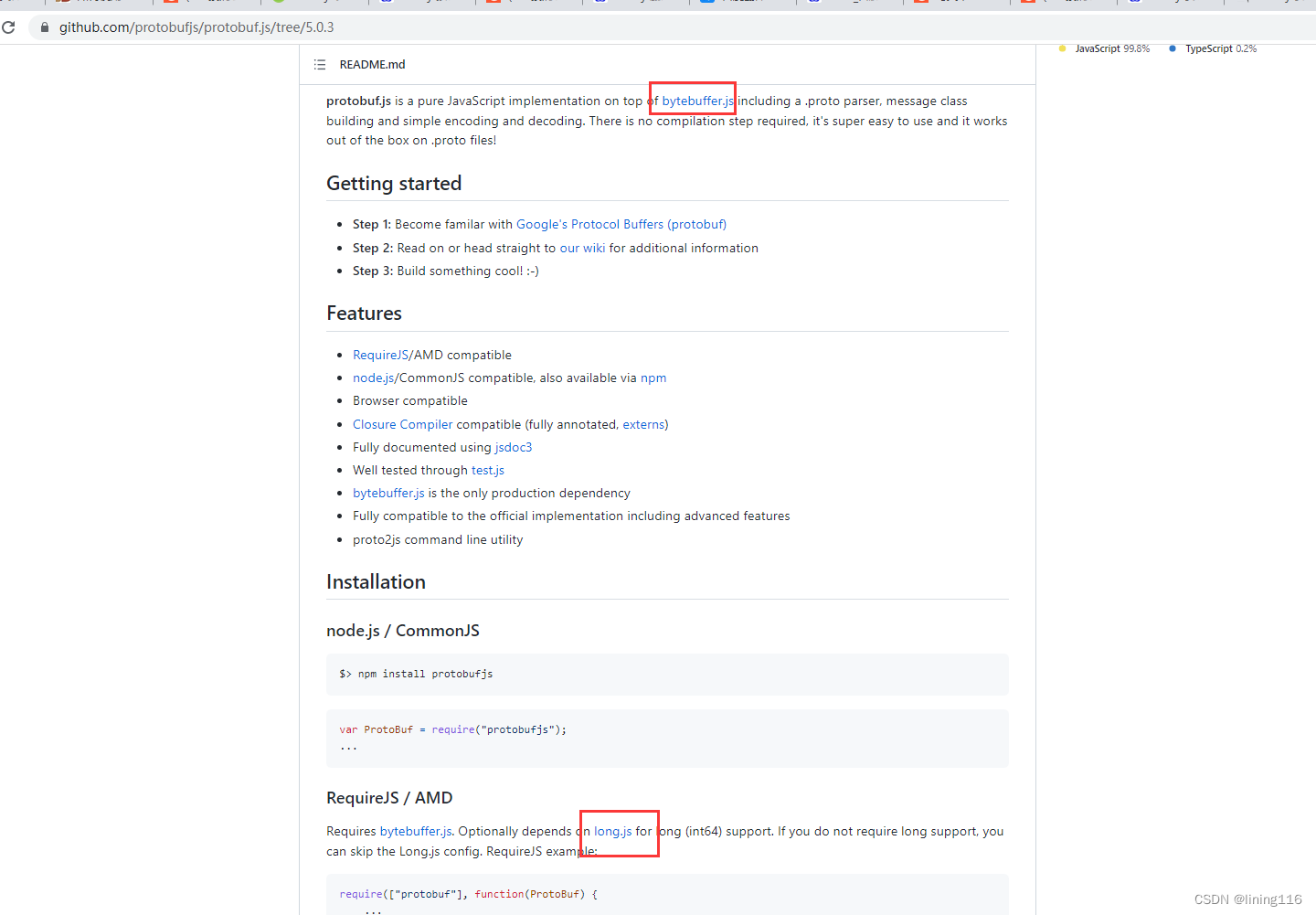 通过官方地址:https://github.com/protobufjs/protobuf.js/tree/5.0.3下载依赖的long.js和bytebuff.js文件