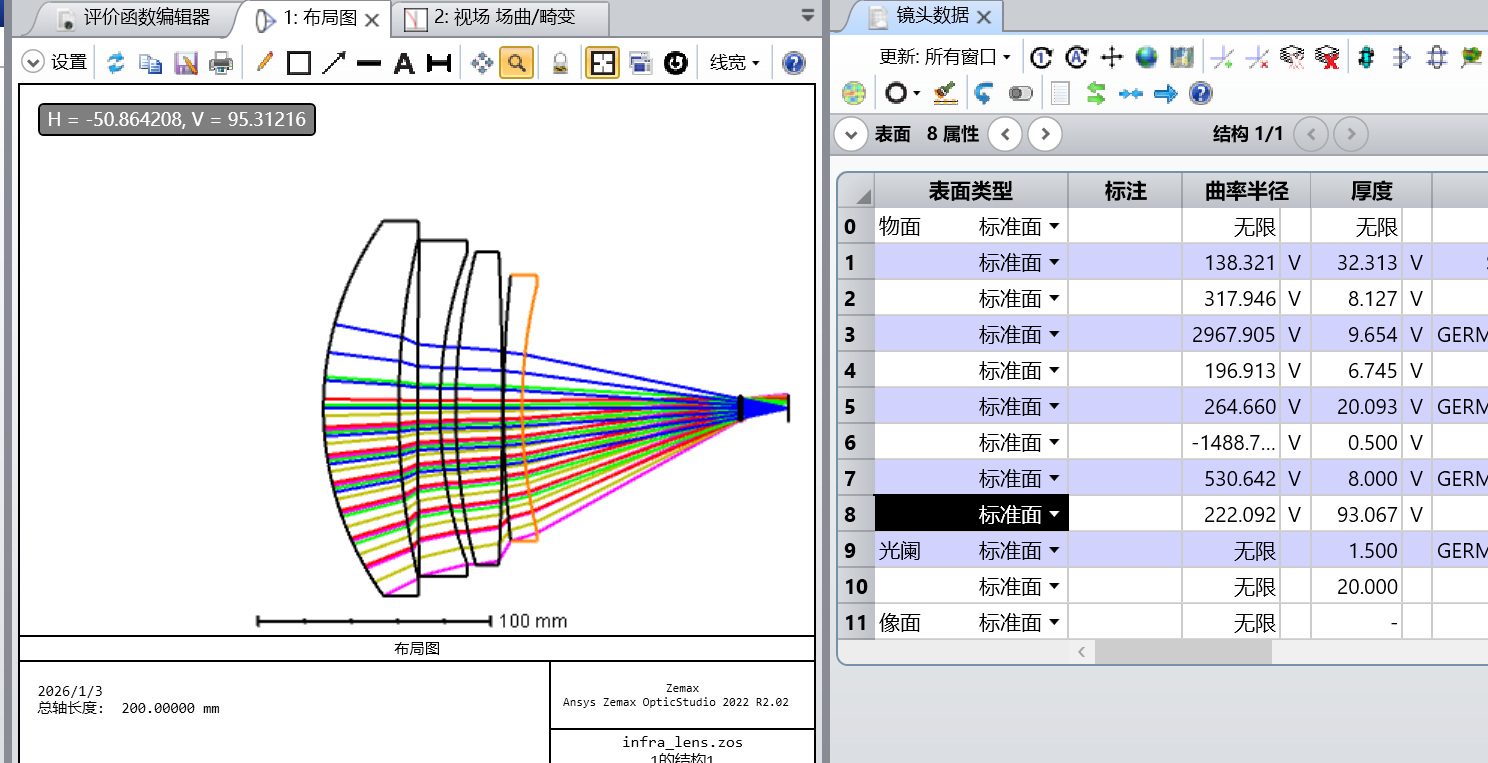此次结果问题在于中间2个透镜太薄,只有接近8mm,在操作数中设置目标值10mm,进行优化,可以看出优化结果中的评价函数已经非常小了0.001,所以在优化过程中判断什么时候停止不是小了才停止是基本不变即可以停止优化。