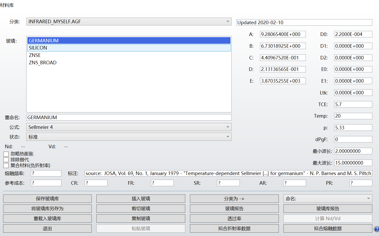 无热化设计需要考虑透镜厚度和透镜间隔随温度的变化,需要知道玻璃的热膨胀系数。玻璃库中给出了隔热系数TCL