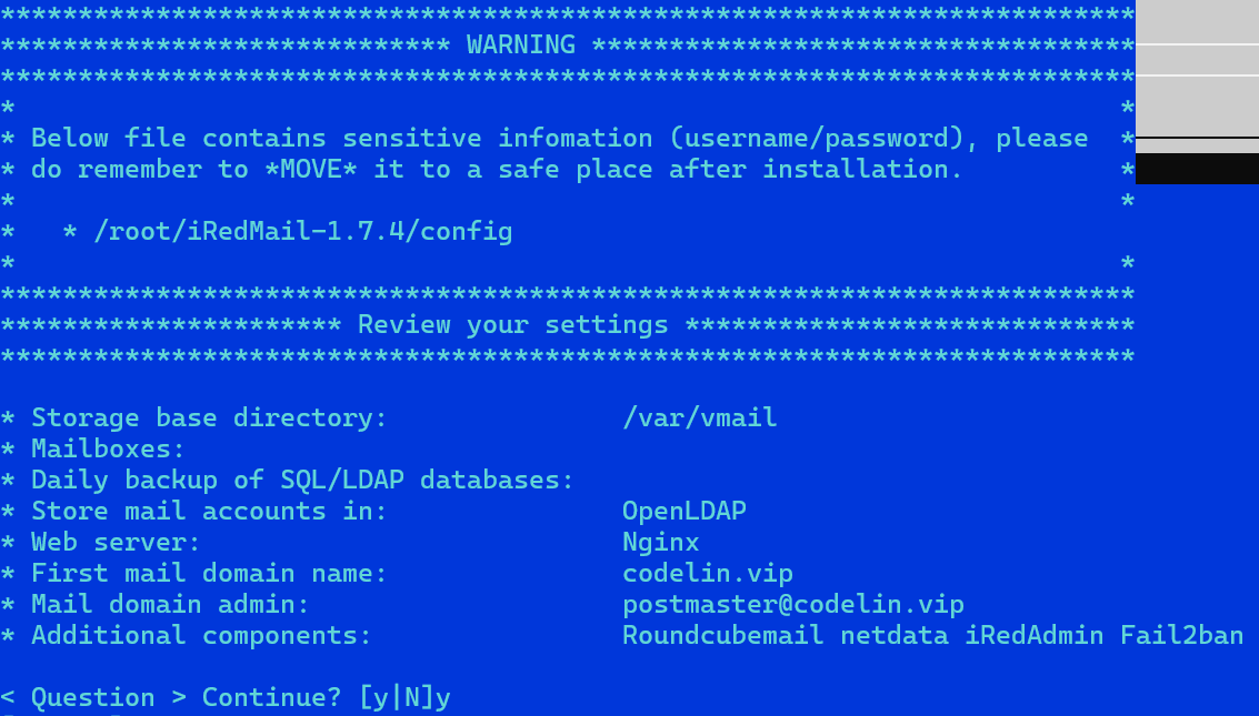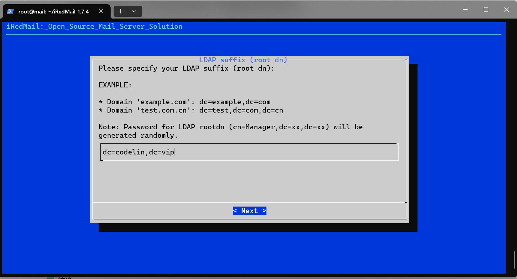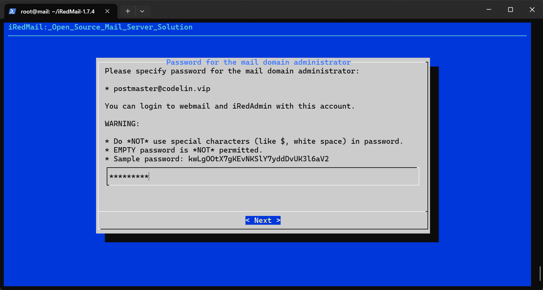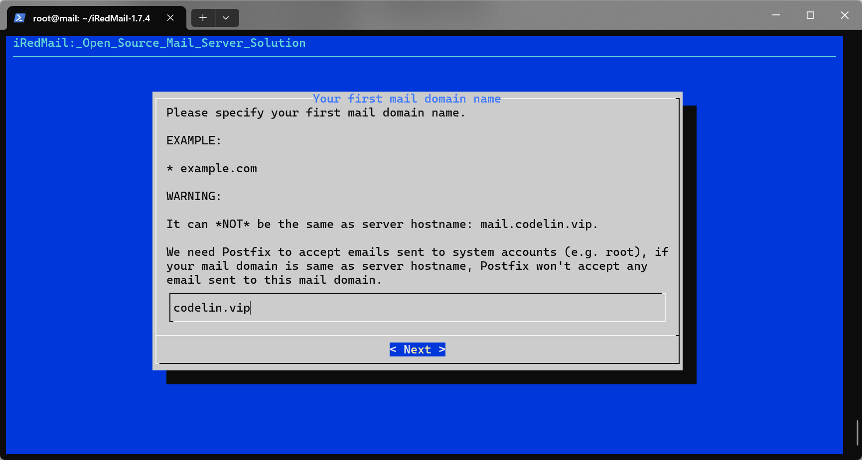 在 iRedMail 安装时,会让你填写 第一个邮件域名(Primary domain)。