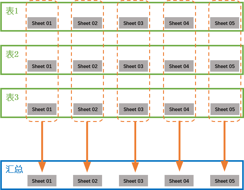 对于每张 sheet,遍历文件夹内所有 excel 表合成该张 sheet 的汇总。