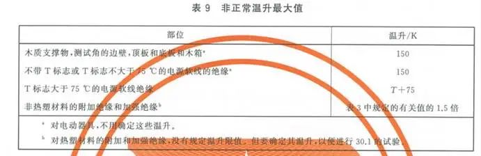 19.13在试验期间,器具不应喷射出火焰、熔融金属、达到危险量的有毒性或可点燃的气体,且其温升不应超过表9中的规定值。