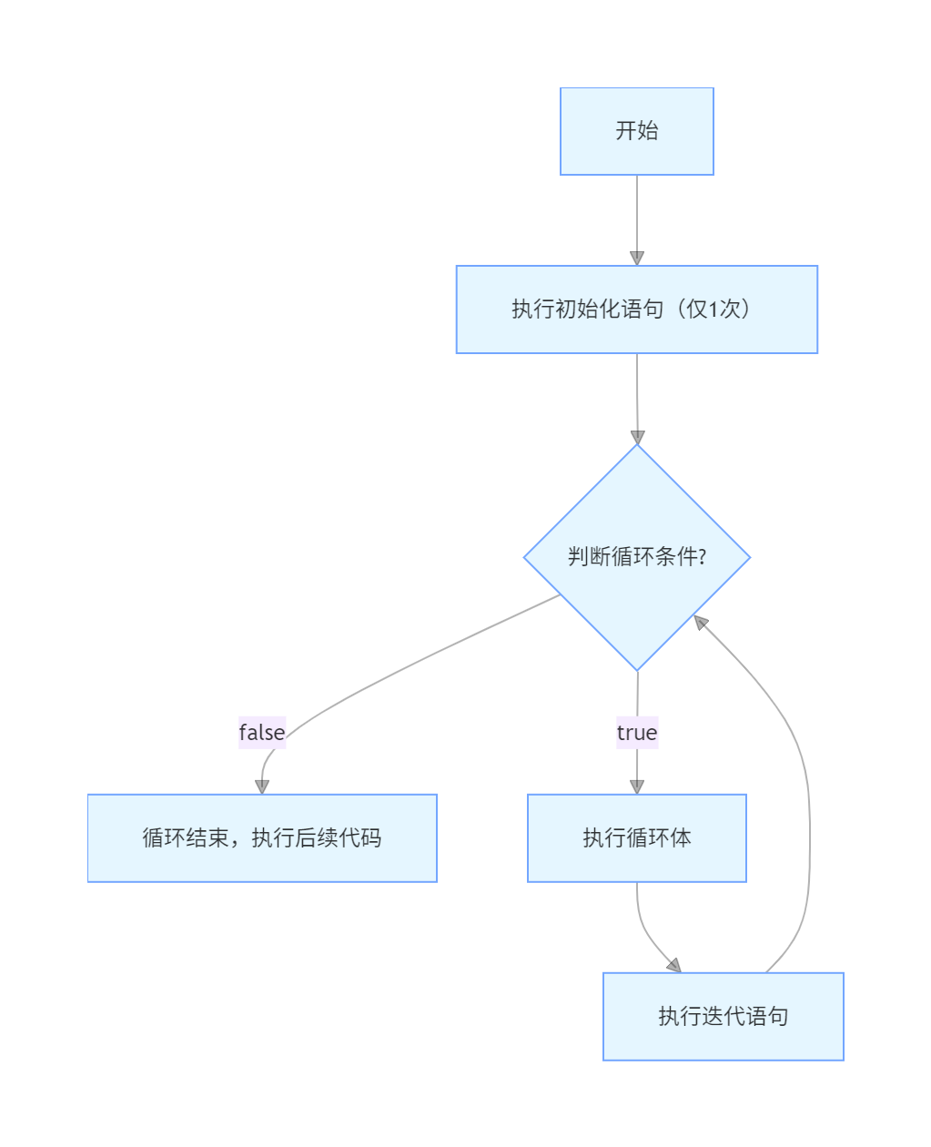 2)然后判断条件,如果条件为true,执行循环操作代码块,循环操作代码块执行完,执行迭代代码,迭代代码执行完,再去判断循环条件