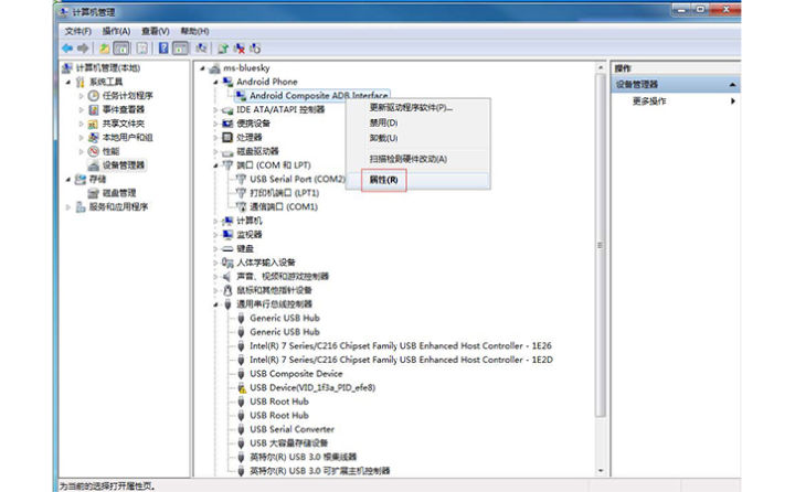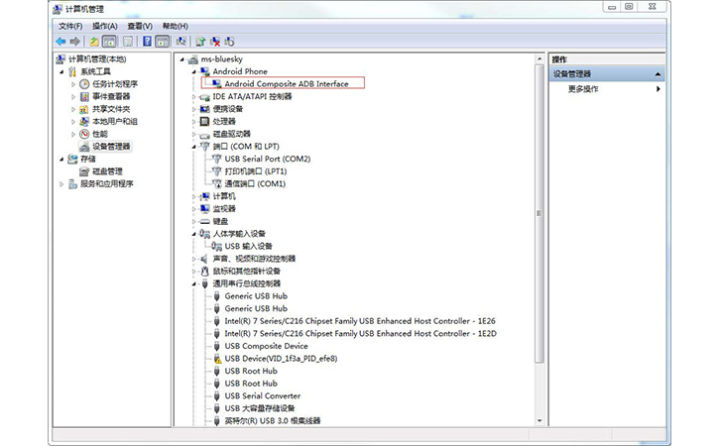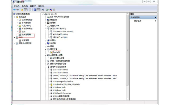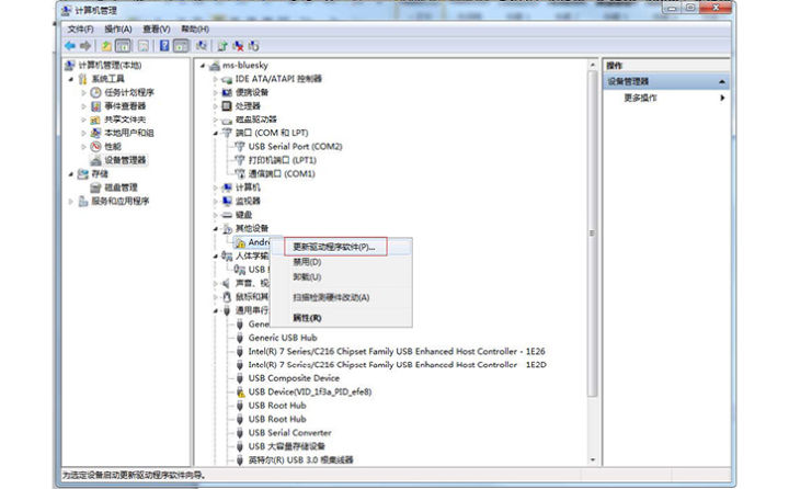 在windows 7的计算机管理,设备管理器中,安装adb驱动;